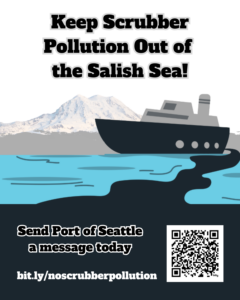 The majority of water pollution from cruise ships – over 95% of it –  is something that most people have never heard of: scrubber waste. Scrubbers use vast quantities of seawater to continuously “scrub” toxic contaminants from ships’ exhaust, and then dump that now-polluted water directly back into the ocean.  Seattle’s cruise ships discharge over 4 billion gallons of toxic, acidic scrubber wastewater each year, harming the marine environment, wildlife, fisheries, and people’s health. Other sources of water pollution from cruise ships include “greywater,” which is dirty water from sinks, showers, laundry and kitchens; sewage; garbage; and hazardous waste.  Learn more about scrubbers, the harm they cause, and potential solutions, here.